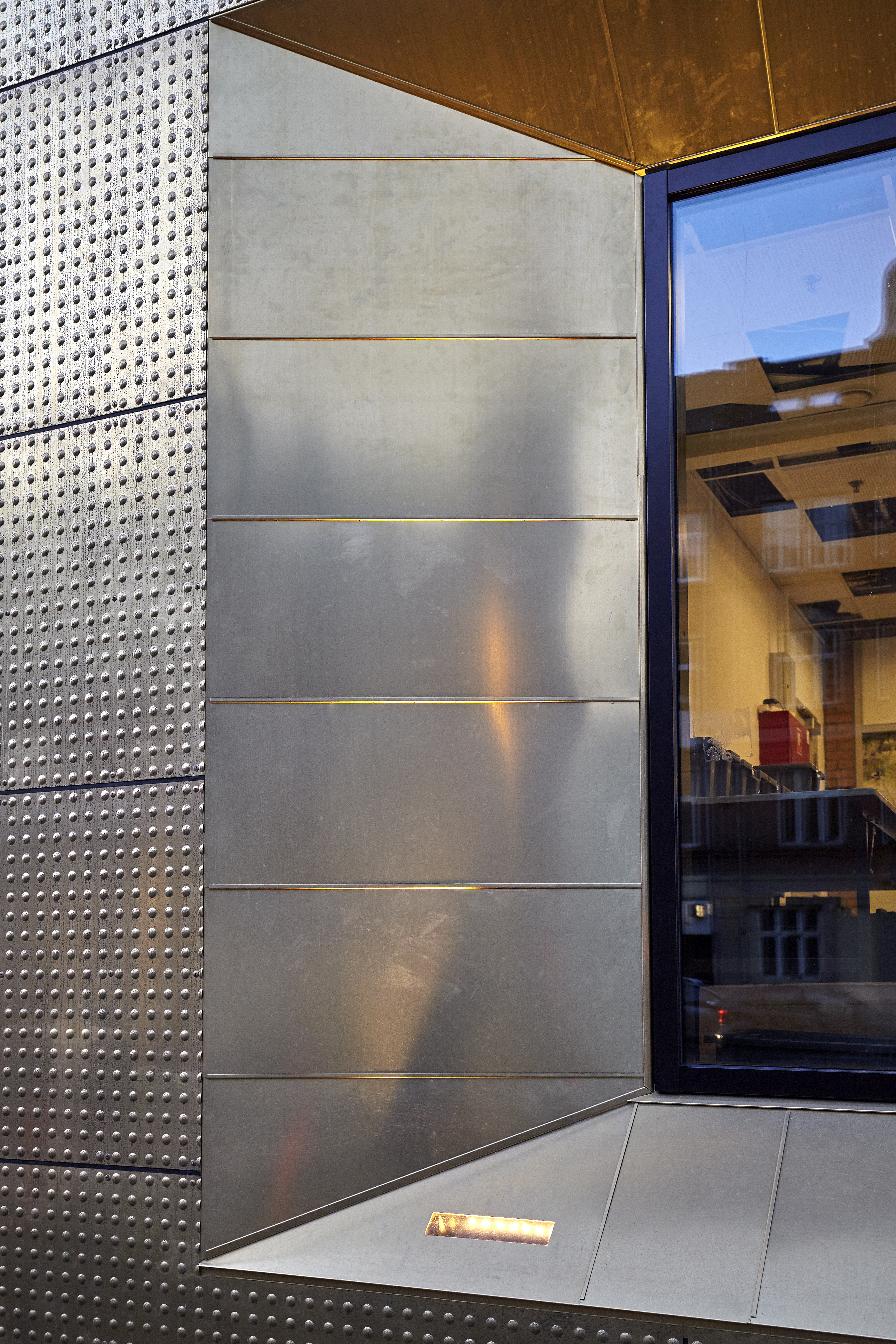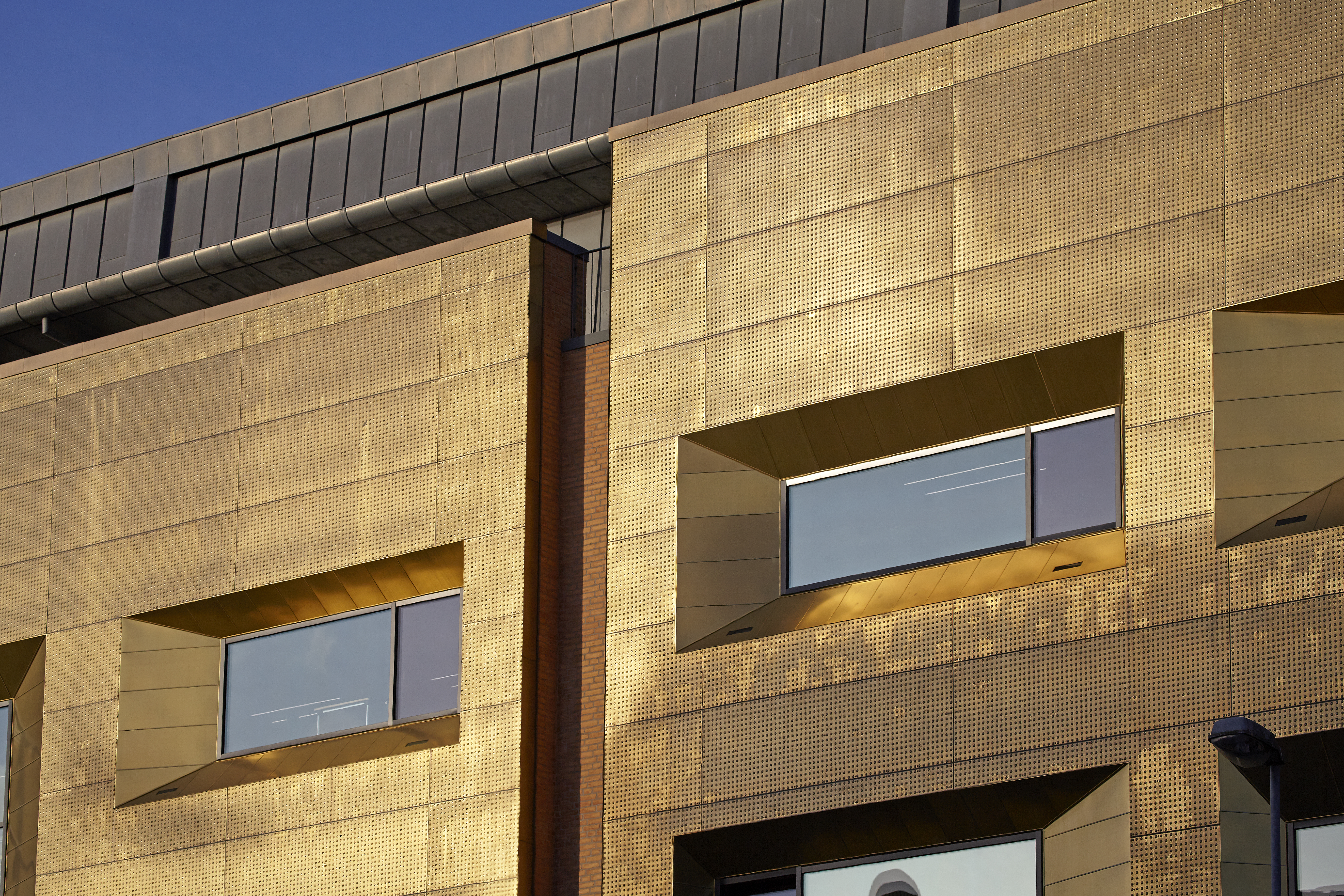 Rundt de store vinduspartiene er det laget skrå lysninger i TECU Gold. Dette materialet oppnår en matt patina, som på sikt vil utvikle seg til et gyllent, brunt utseende.