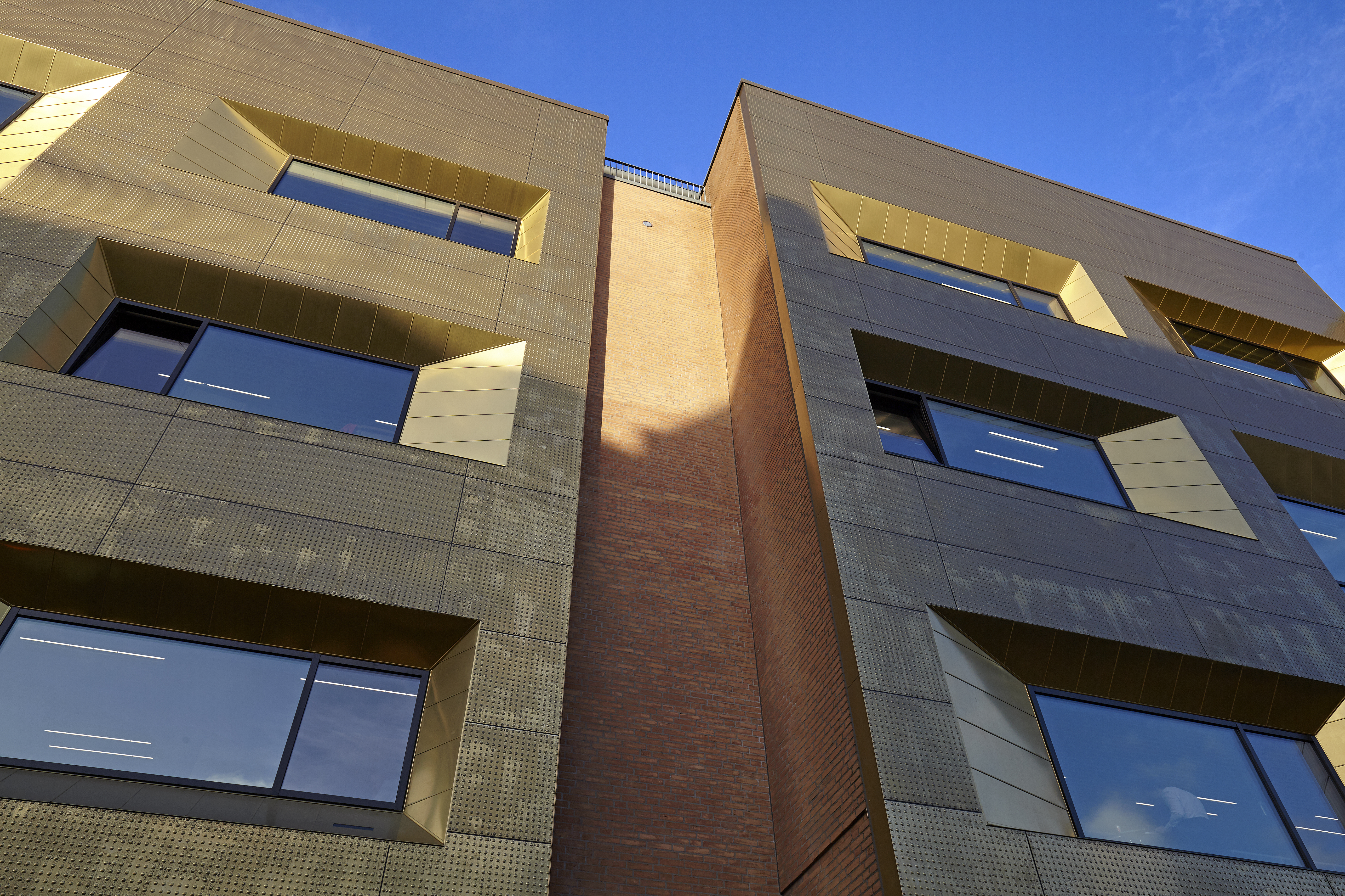 Til sammen skaper sammensetningen av disse to materialene et gyllent blikkfang, som i høy grad setter fokus på Borgernes Hus i bybildet i Odense.