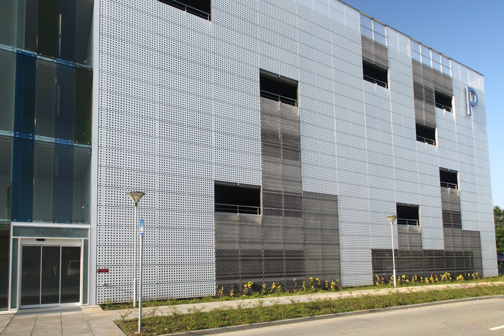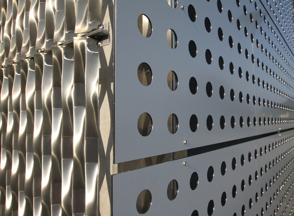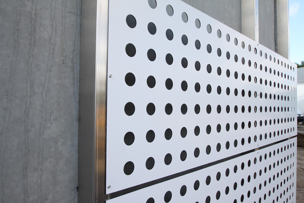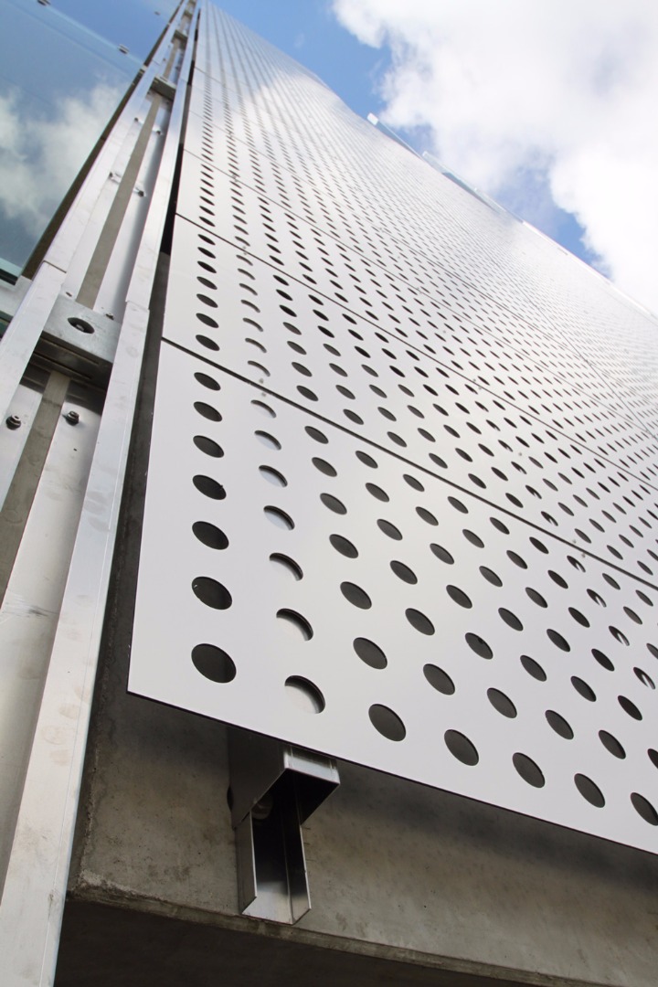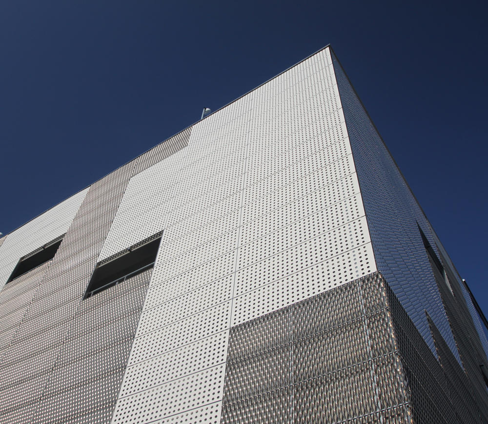 Årstiderne Arkitekter valgte ALUCOBOND-plater som fasadekledning. Ca. 700 m2 med perforerte Alucobond-plater i PE-kvalitet ble levert. I tillegg ble det brukt 3 typer aluminiumsprofiler i legering EN AW-5754 (korrosjonsfast) til støtte av platene.