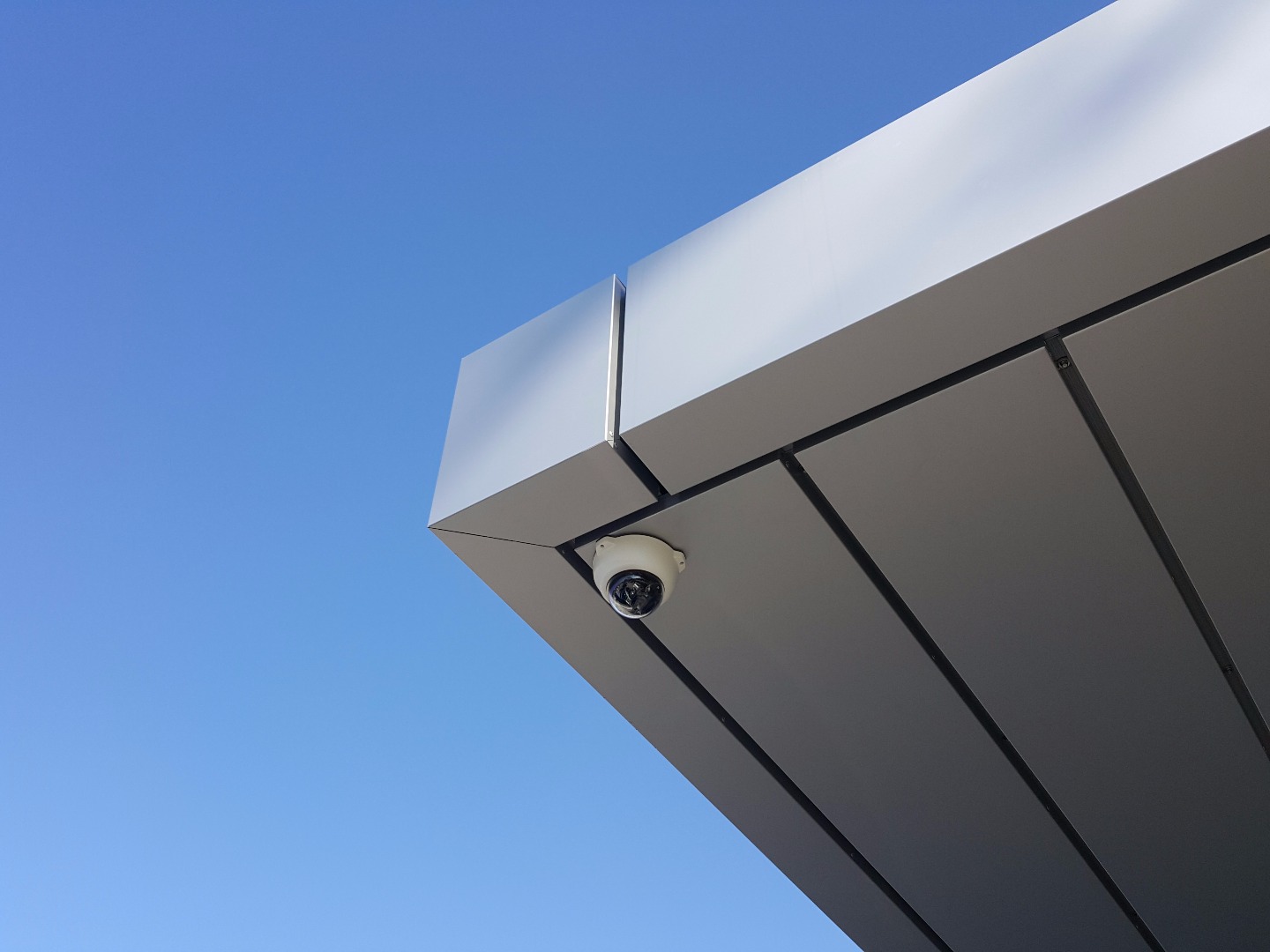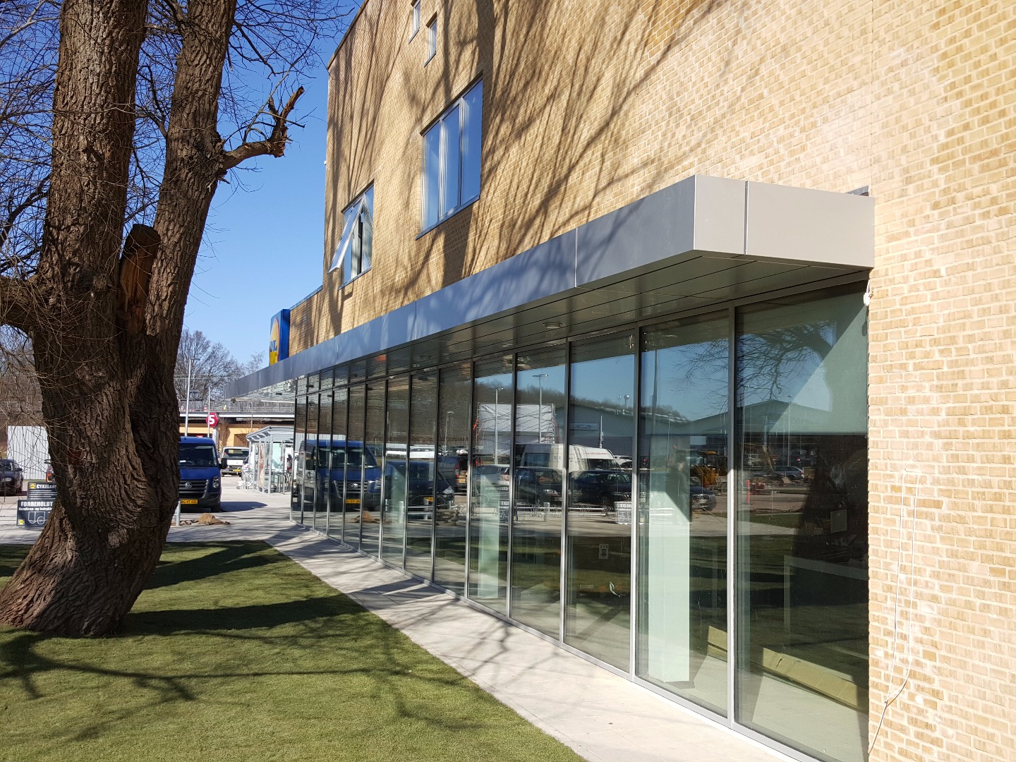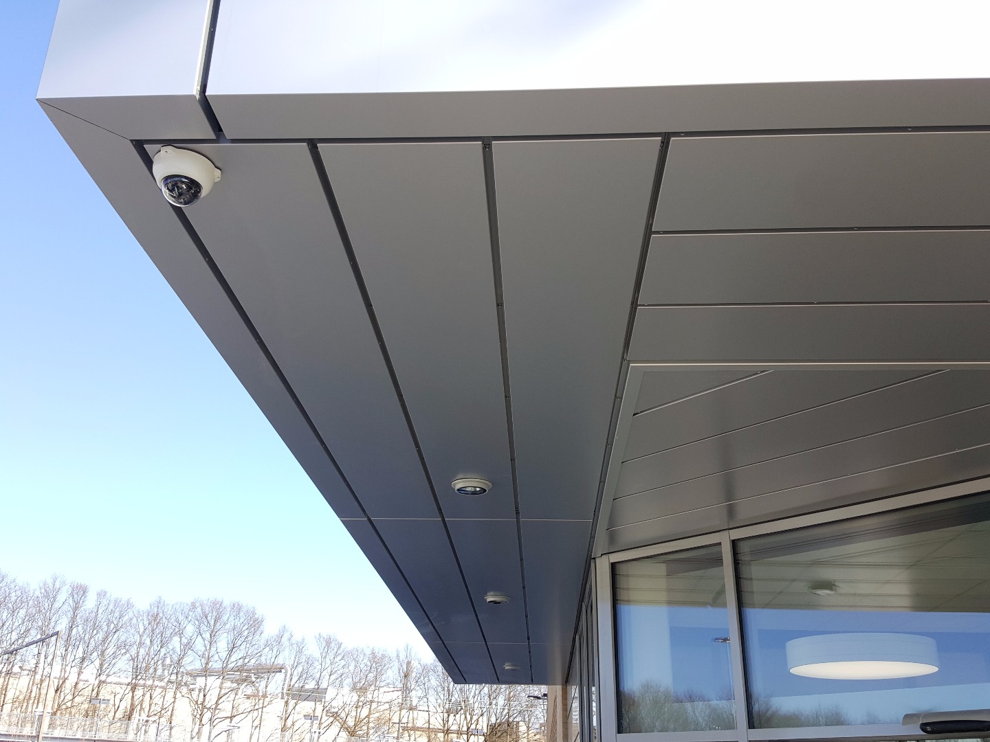 Utvendig kledning på vegg og undertak rundt butikkens inngang med Alucobond-kassetter i fargen Silvermetallic 500.