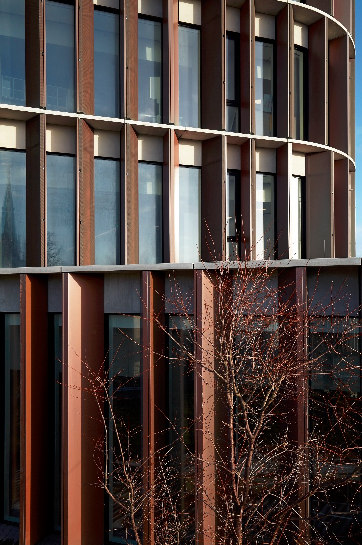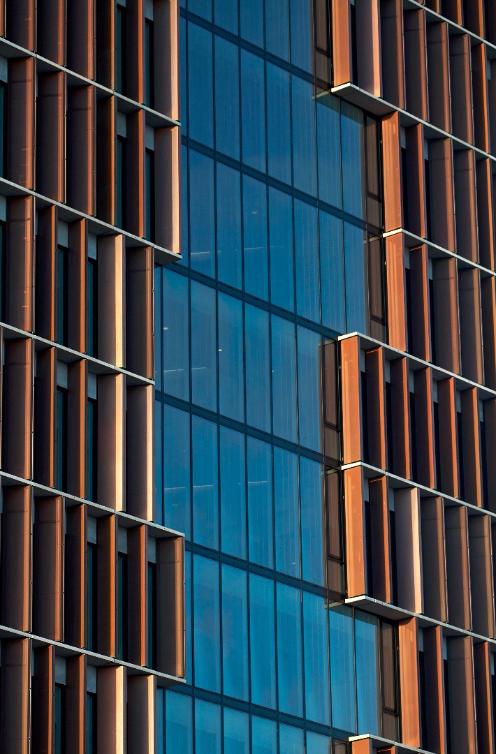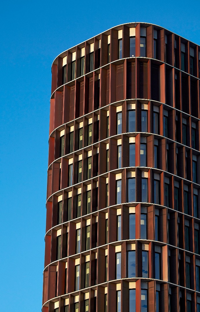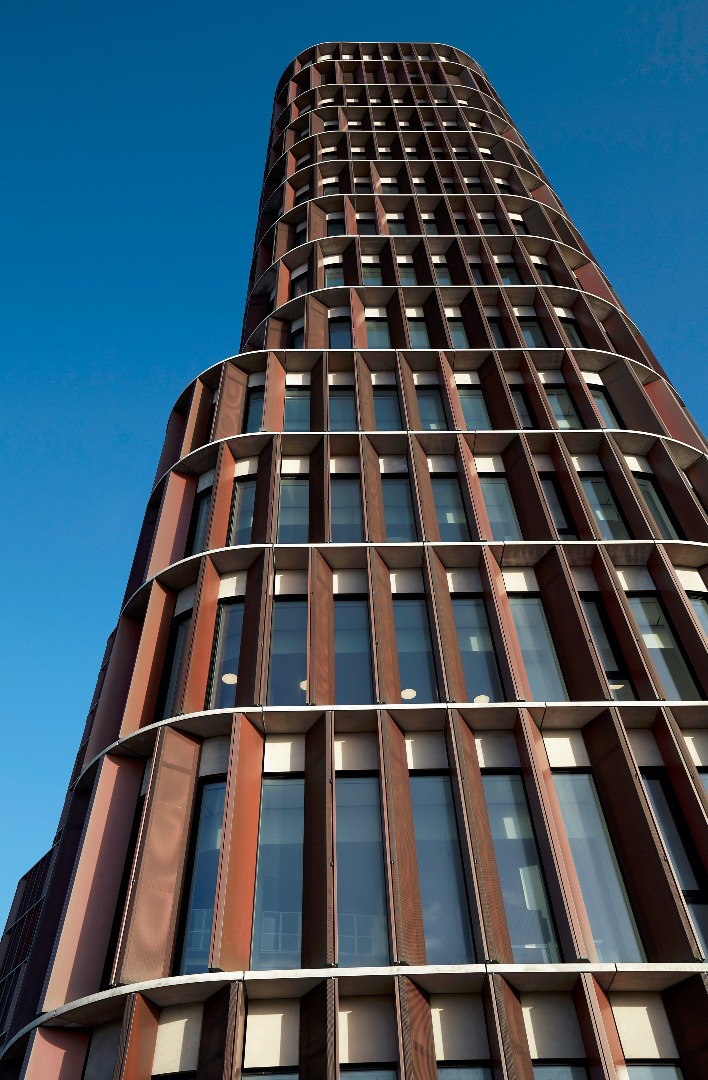 Mærsk Tårnets fasader er kledd med TECU Clasic Bond og TECU Kobber Mesh.
