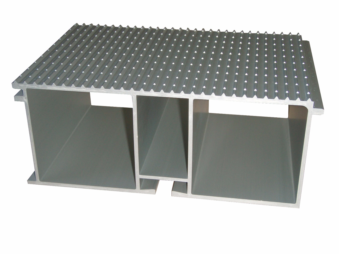 Broens dekke er laget av pressede rørformede gangbroprofiler i aluminium som er 200 mm brede.
