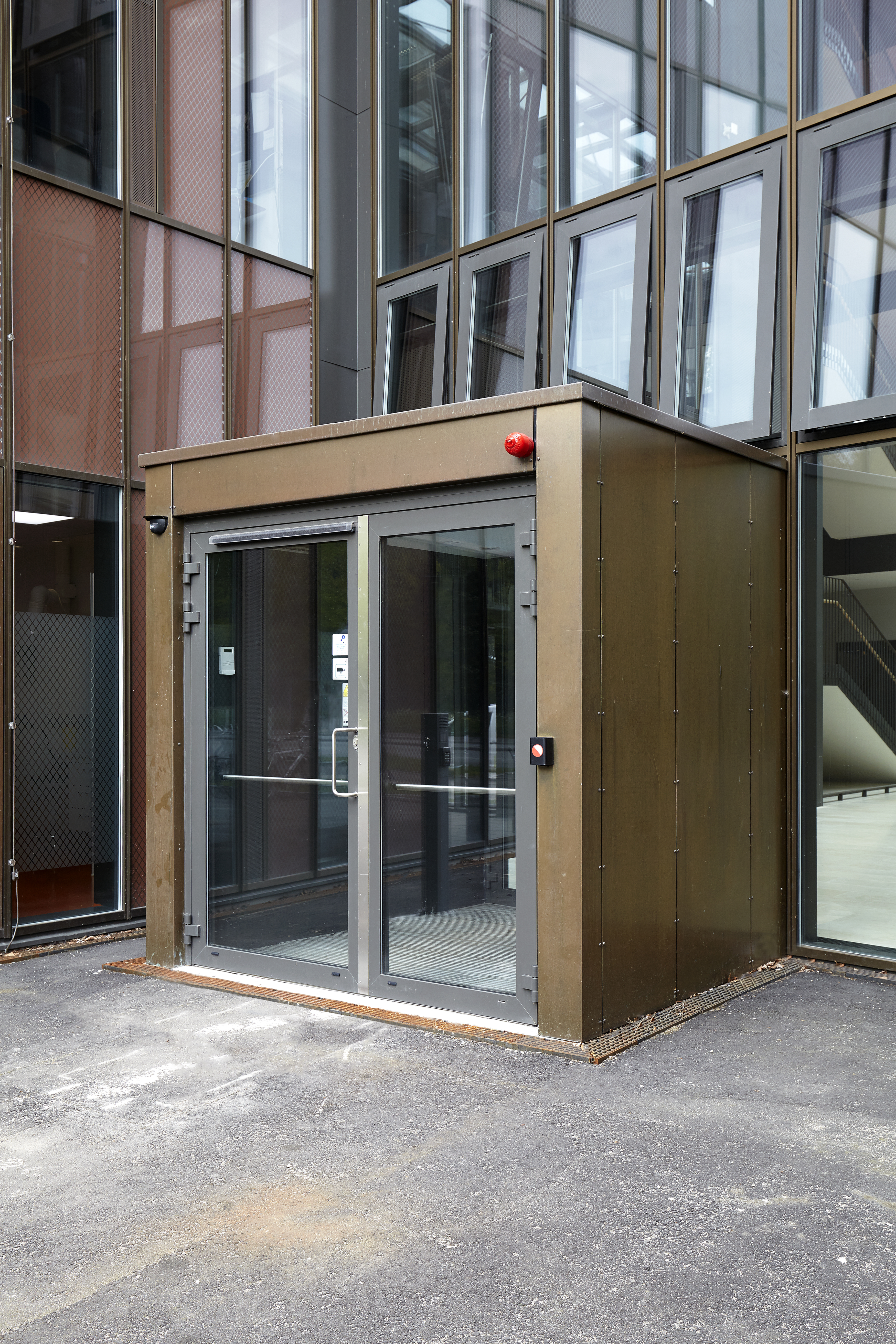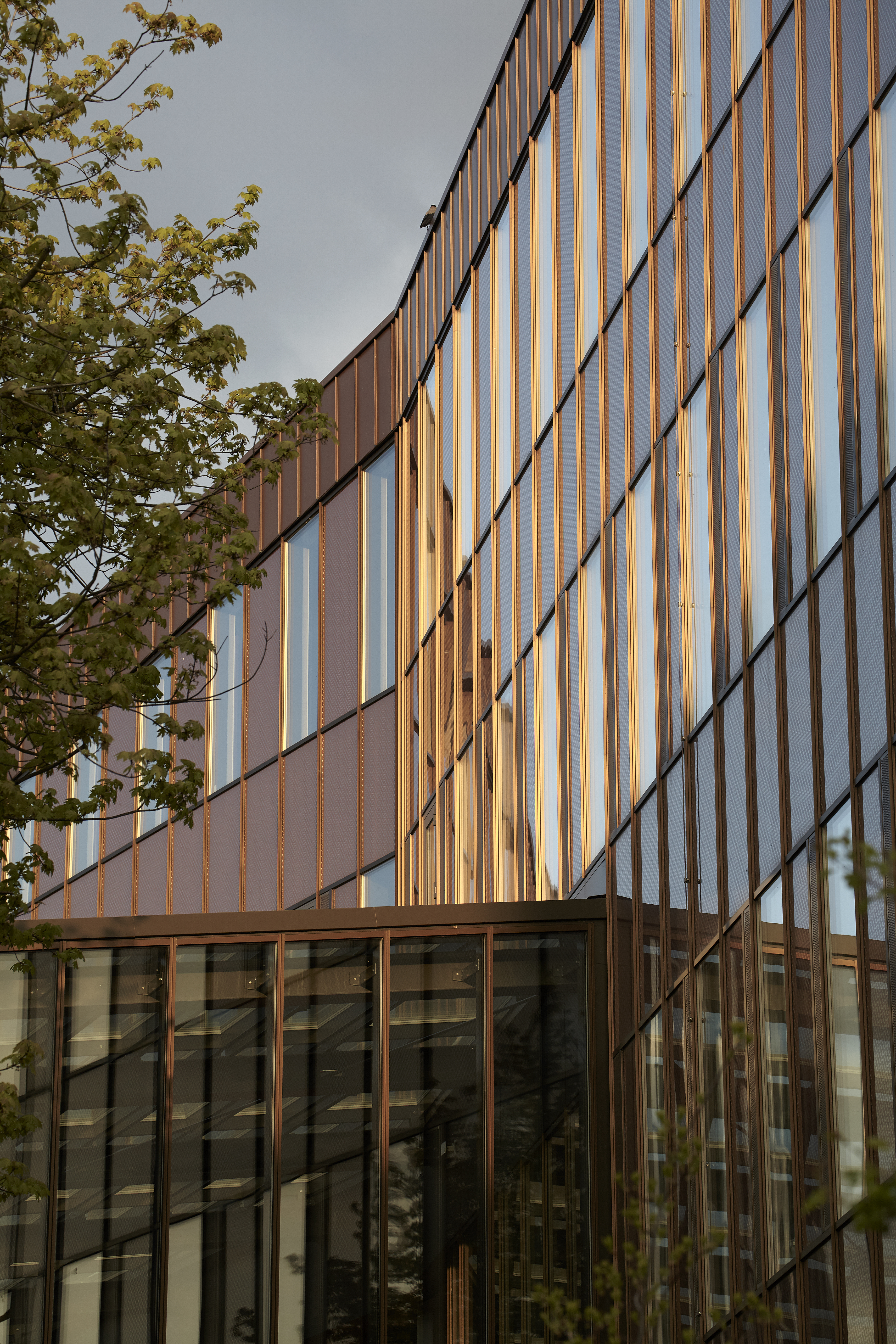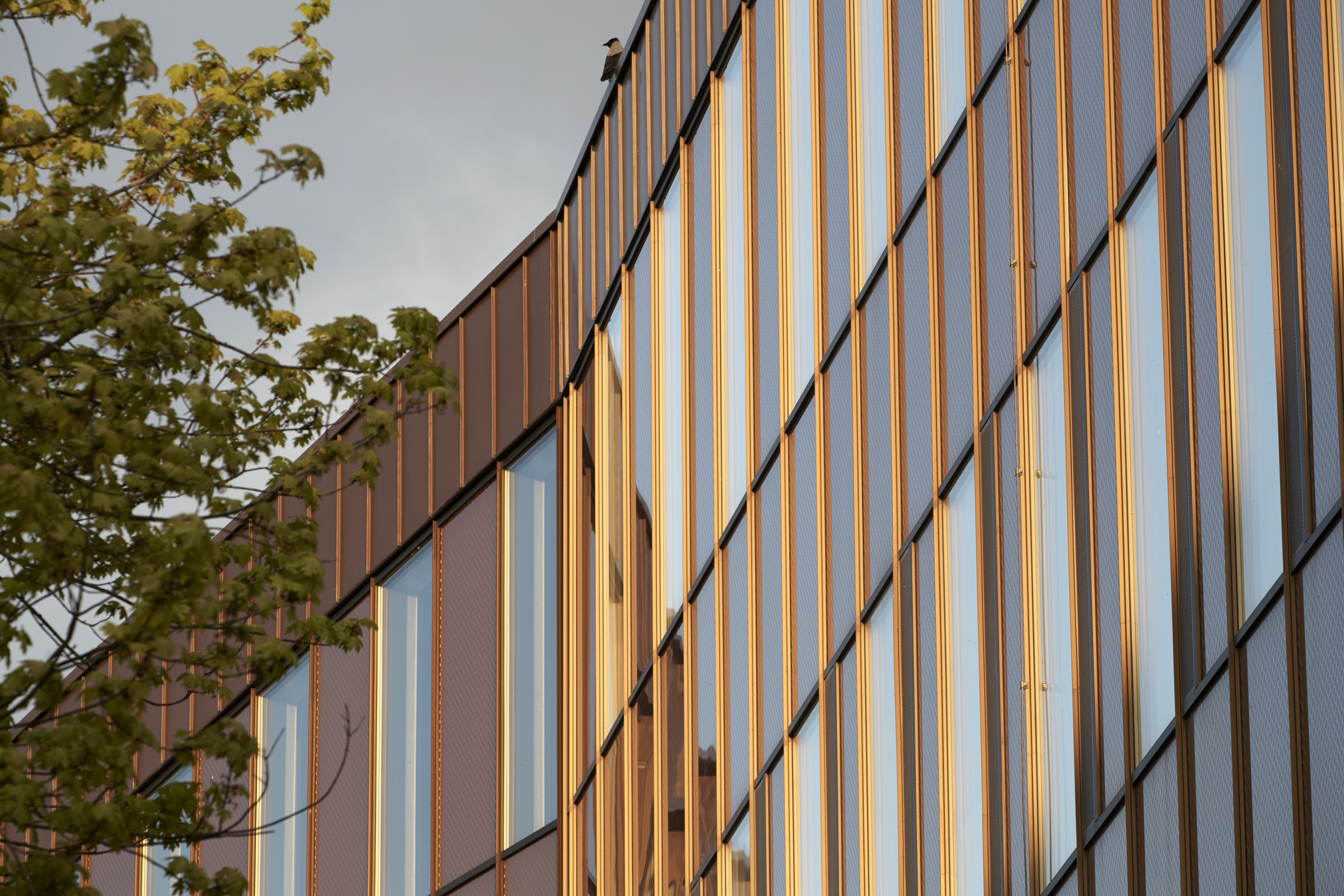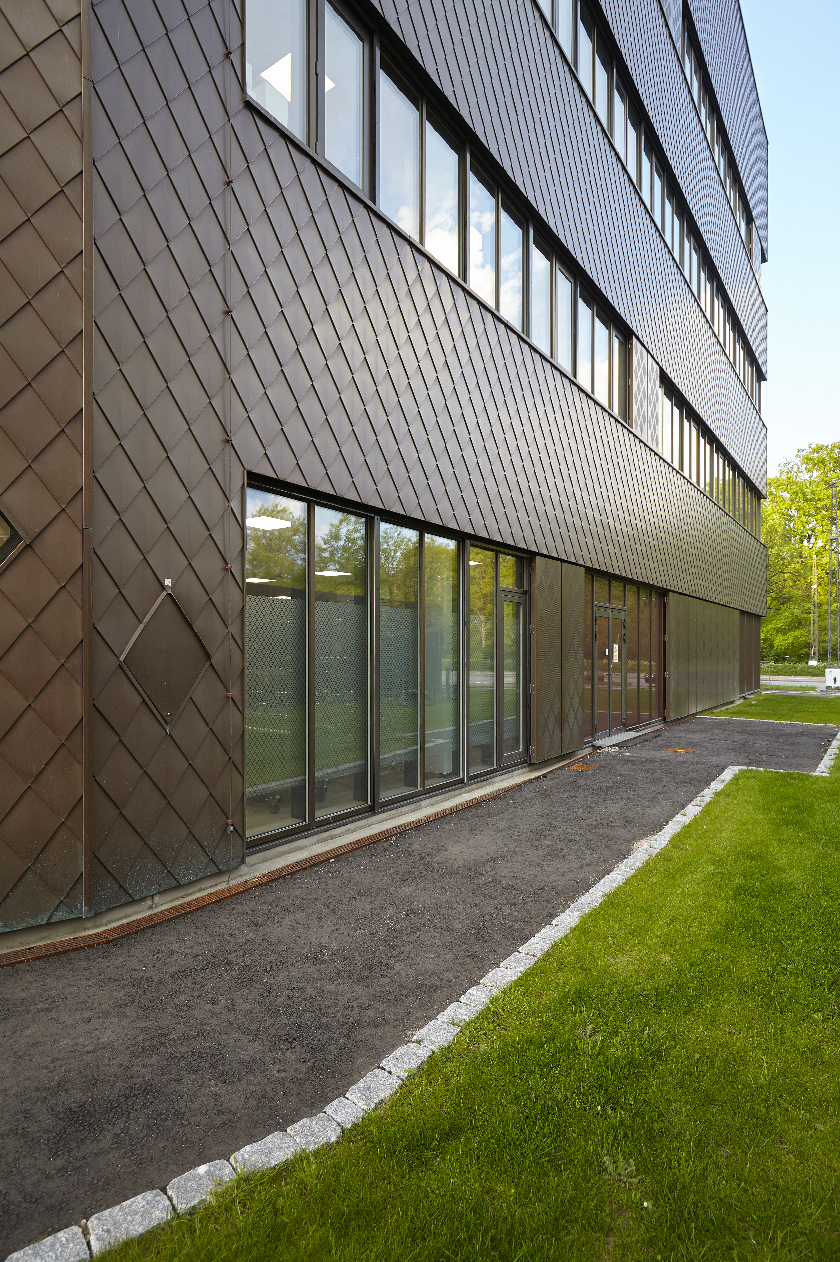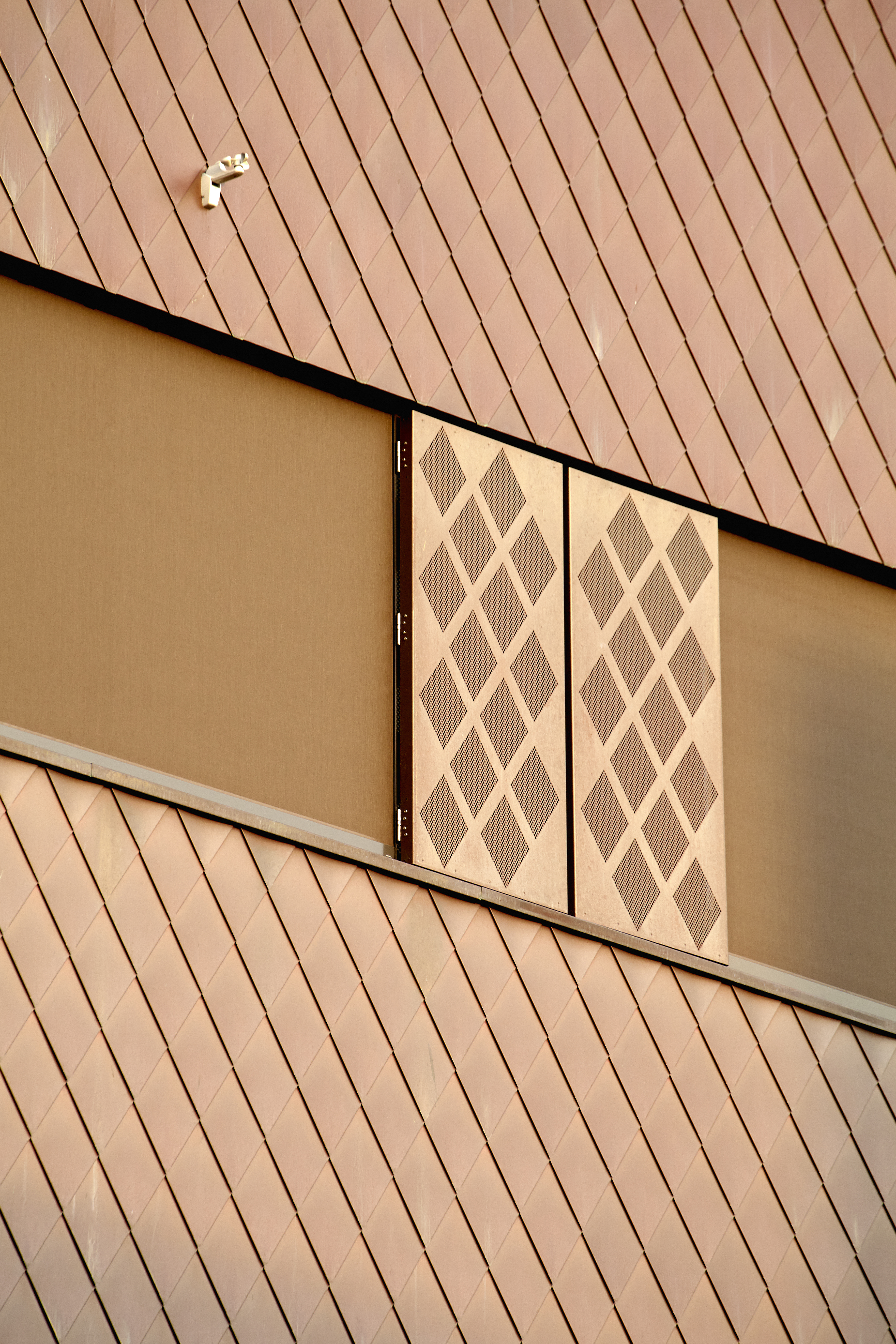 Bygningens fasader er kledd med Tombak CuZn15, som er et KME materiale, levert av Metalcenter Group. Fjellsø Entreprise har bearbeidet materialet til rutekledning/shingles på 1 mm tykkelse. Rutekledningen gir bygget et geometrisk uttrykk, som understrekes av det mørke Tombak-materialets gyldenbrune patinering.