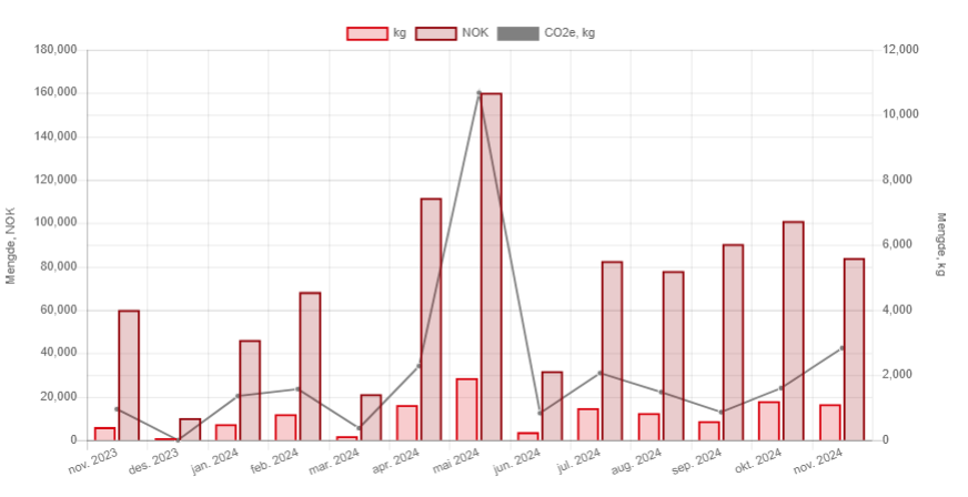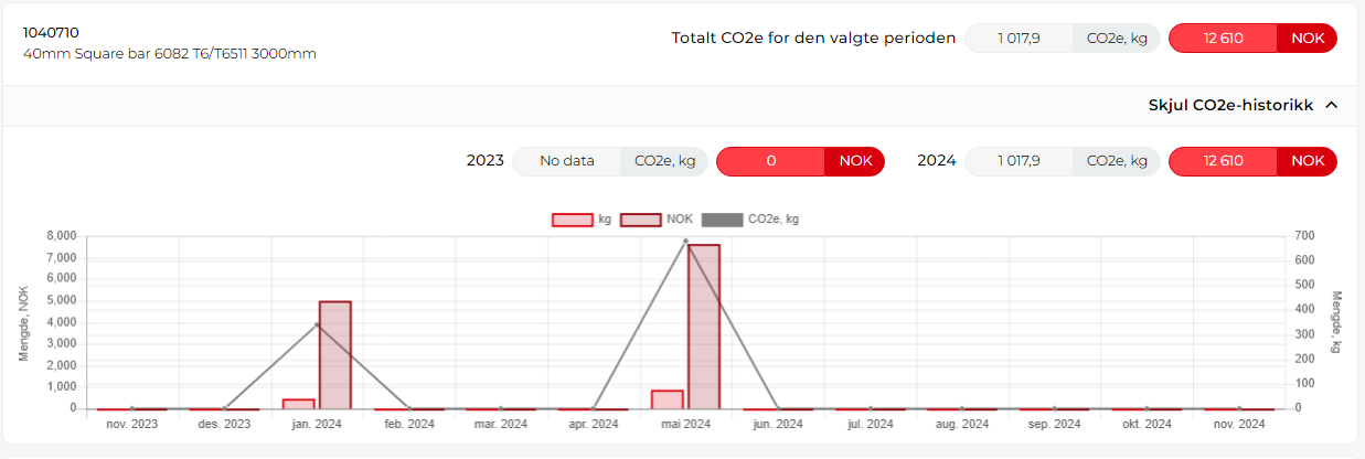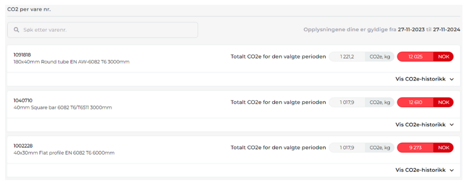Du kan laste ned CO2-tallene for produktene du har kjøpt fra Alumeco. Du kan se en total oversikt over en bestemt tidsperiode eller utslippene for hvert enkelt varenummer - eller en kombinasjon av de to.